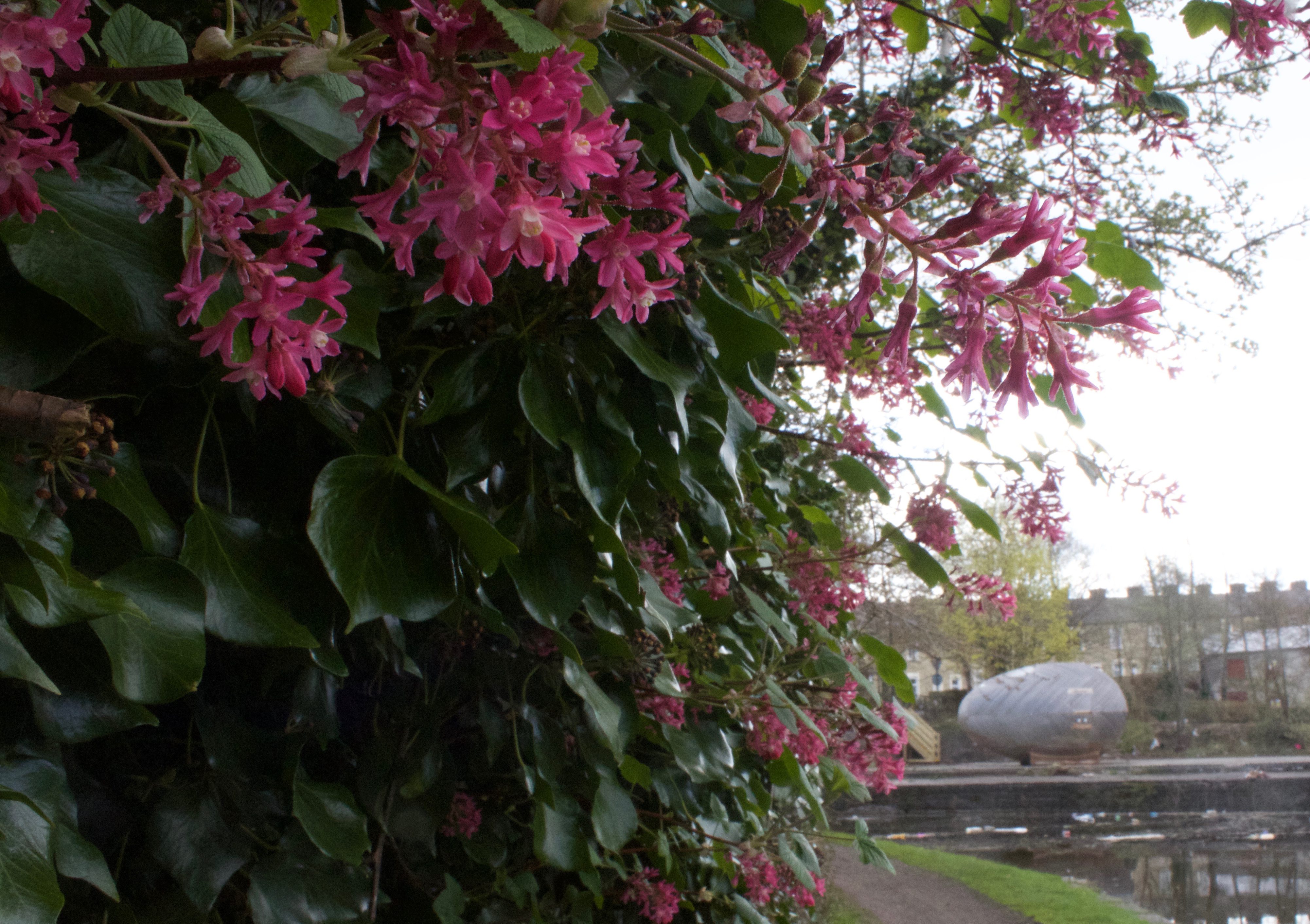 The former kitchen garden of the wharf keepers house has been rescued from a dense entangled thicket of brambles, but any sort of new growth is waiting yet for some warmth to the soil and air. The mature cherries on site are in bud though, and across the canal great yellow sunbursts of renegade forsythia, pepper perspectives by the bridge. Red flowering currant, native to the west coast of the USA, is creeping through railings bounding the freshly demolished site of the Lambert Howarth & Son factory across the canal.